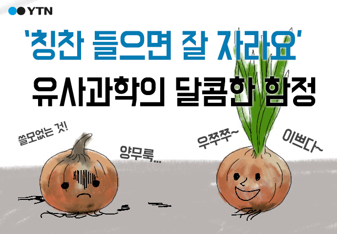 몇 년전 양파를 두 개를 동일한 조건에 놓고 한쪽에는 나쁜 말, 다른 한쪽은 좋은 말을 하는 테스트가 있었다. 실험기간은 몇 주 혹은 한 달 정도였으며 그 결과는 당연히 좋은 말을 해준 양파가 잘 자랐다는 아름다운 결말이었다. 이 실험은 어느 한 방송의 한 프로그램에서 해준 곳으로 당연히 그 결론을 찰떡같이 믿었던 어느 날 친구에게 '양파에게 좋은 말하면 잘 자란 대'라고 당연하게 말을 했다. 그 친구는 어이없다며 맹비난하며 비웃던 것이 생각난다. 그래 니 말이 옳았다.이 넘의 방송국의 말을 믿다뉘.