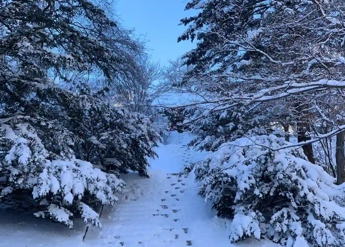 살짝 길을 생겼지만 한 명이 겨우겨우 지나갈 정도이고 눈의 높이를 재보니 일단 평균 내 무릎이상으로 아이젠을 싣었음에도 줄줄 미끄러지고 넘어지고 어디가 평지인지 바위인지 알 수가 없어 스틱도 무용지물인 여전한 눈밭이었다. 게다가 평탄한 능선과는 달리 향적봉 대피소에서 백련사까지는 중상 난이도인 보라색로 상당히 가파르기 때문에 특히 주의가 필요했다. 행여나 넘어지면 대굴대굴 굴려 피 흘린 눈사람이 될 수도 있으니 조심조심하면서 내려갔다.