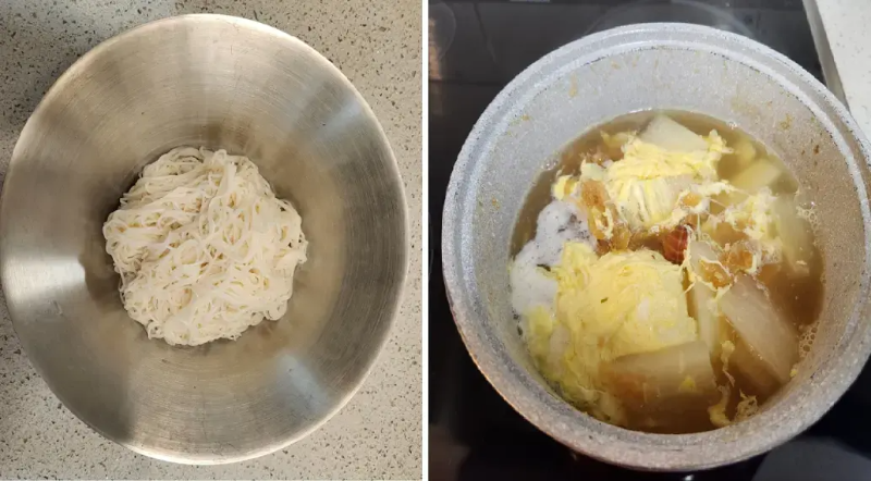 육수는 면이 준비될 때까지 끓여 준다. 오래 끊을수록 육수 맛이 더 좋아지니 적어도 30-40분 이상 끊여야 한다. 면이 준비되면 계란 2개를 풀어서 흰자와 노른자를 휙휙 저어 준다. 그리고 육수에 붓는다. 다시 한번 팔팔 끓여준다.
