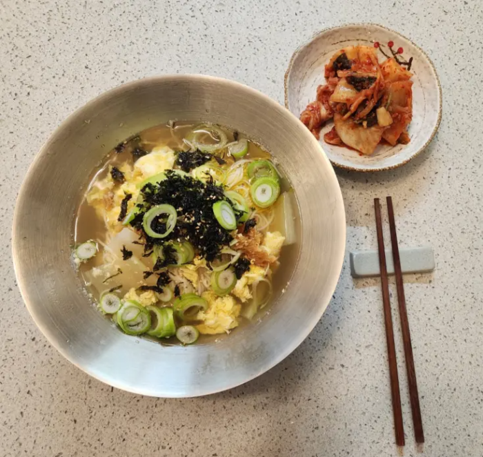 채 썬 대파와 김가루 넣고 참기름을 몇방울 떨어뜨리면 고소함을 맛볼 수 있다. 바로 먹어야 탱탱한 면의 식감을 느낄 수 있다. 우리는 육수용으로 사용한 무를 국수와 같이 즐겨 먹는다. 시원하면서 먹는 맛도 좋고 해장용으로도 좋다.