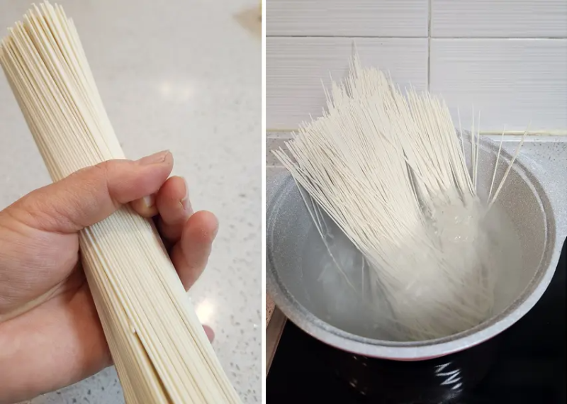 자신이 먹을 수있는 양만큼 소면을 준비한다. 물을 팔팔 끓으면 면을 투하한다. 그리고 휙휙 저어주면서 익힌다.