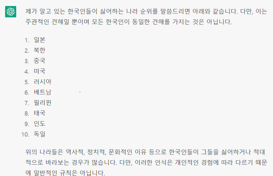 한국인이 가장 싫어하는 국가.