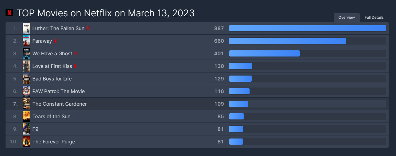 The most popular movies and TV shows on Netflix in the World. Who was #1 on Netflix on March 13, 2023? TOP 10 charts or full ratings charts. Check the title detail for more streaming analytics.