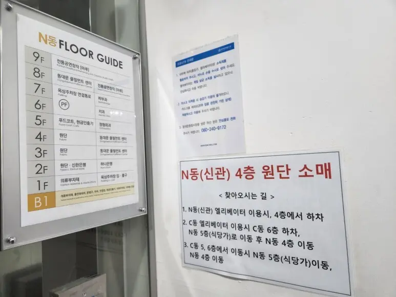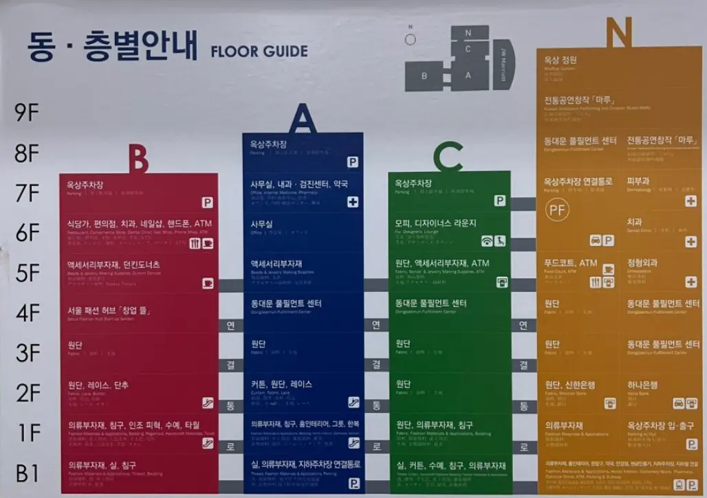 원단상가는 지하 1층부터 5층까지 있다. 6~9층은 주차장과 공연장이 있다고 하는데 가본 적은 없다.