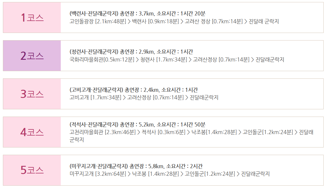총 5코스로 구성되어있는데 대부분 코스는 주차장 시설이 잘 완비되어 있지 않다. 고인돌공원이 그나마 주차장이 있지만 한정되어 있어서 아마도 주차하기 쉽지 않을 것이다. 이 번에 다녀온 백련사 코스는 또한 길폭도 좁고 주차 공간이 협소해축제 전날 평일에 다녀왔음에도 차량이 많아 백련사에서 3.9km 떨어진 곳에 주차했다. 그렇다고 대중교통을 잘되어 있는 것도 아니니 이 점 참조해서 다녀오시길..